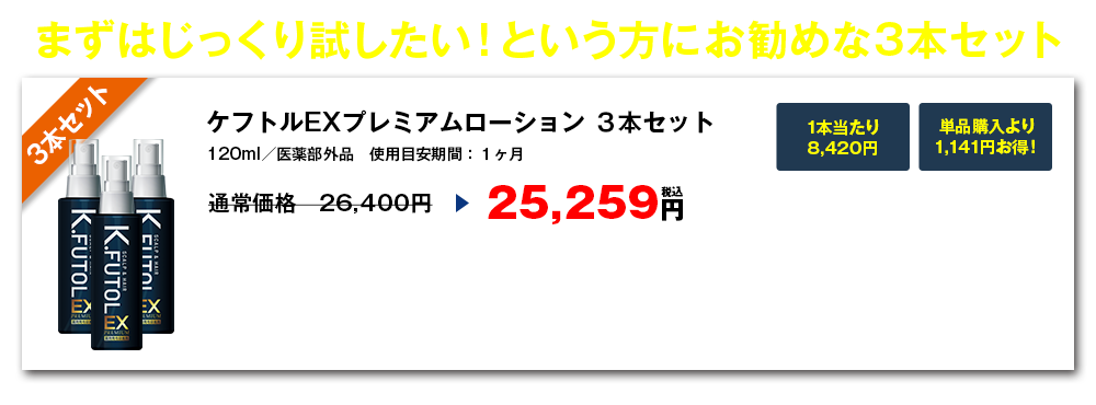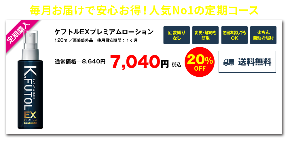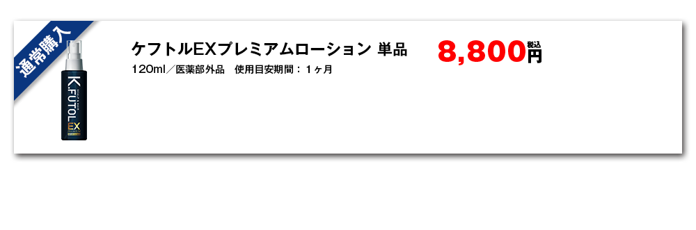 ケフトルEXプレミアムローション(120ml)1本を朝晩の1日2回ご使用頂いた場合、約1ヶ月分となっております。